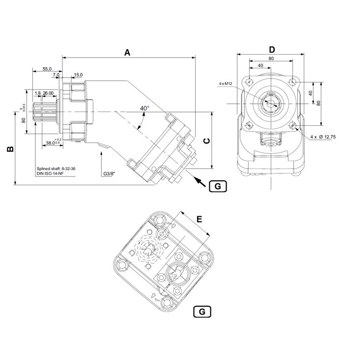 Fixed displacement pump – hole pattern 80 x 80 – dia. 80 – shaft 8x32x16 ISO 14 – threaded fitting