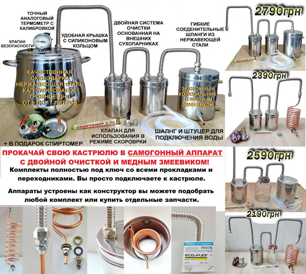 На фото представлены, лишь несколько вариантов комплектации дистилляторов. Благодаря единому стандарту 1/2 дюйма Вы можете подобрать свой индивидуальный комплект.