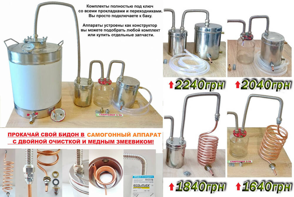 На фото представлены, лишь несколько вариантов комплектации дистилляторов. Благодаря единому стандарту 1/2 дюйма Вы можете подобрать свой индивидуальный комплект.