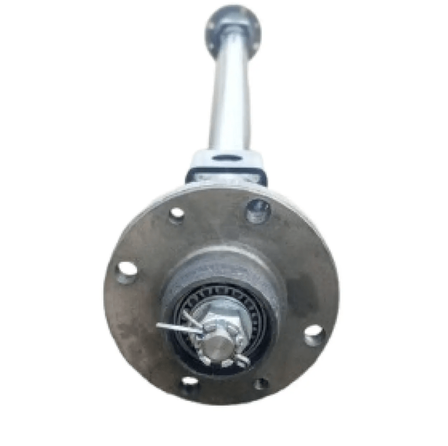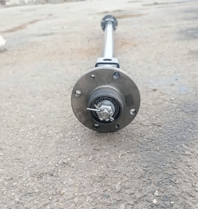 В ступице балки установлены подшипники 2101 конусного типа, известные своей надежностью и долговечностью. Они обеспечивают плавное вращение колес и защищены корончатой ​​гайкой со шплинтом, которая обеспечивает безопасность крепления и предотвращает самооткручивание. Сверху ступицы установлен железный колпачок, надежно защищающий узел от пыли, влаги и грязи – это особенно важно при перевозке грузов в дождливую погоду или по грунтовым дорогам.