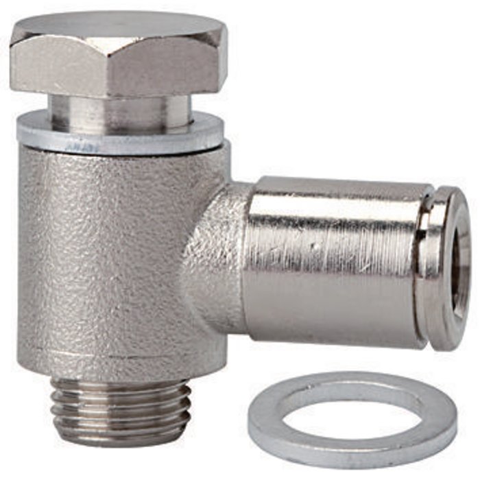 Push-in fittings, manufactured entirely in nickel-plated brass. All parts with a parallel thread are supplied with an FPM O-ring.<br>All parts with conical threads are coated with preCOTE 5 dispersion, all fittings in this series can thus also be used at high temperatures (medium compressed air).