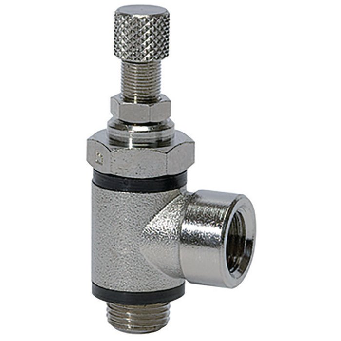 For regulation of a cylinder piston speed at both ends and control of flow rates. Designed as a banjo-type valve with a hollow bolt and ring piece for mounting directly. <br>On the version with a knurled screw, the set volumetric flow rate can be locked with the hexagon nut to obtain a fixed setting.