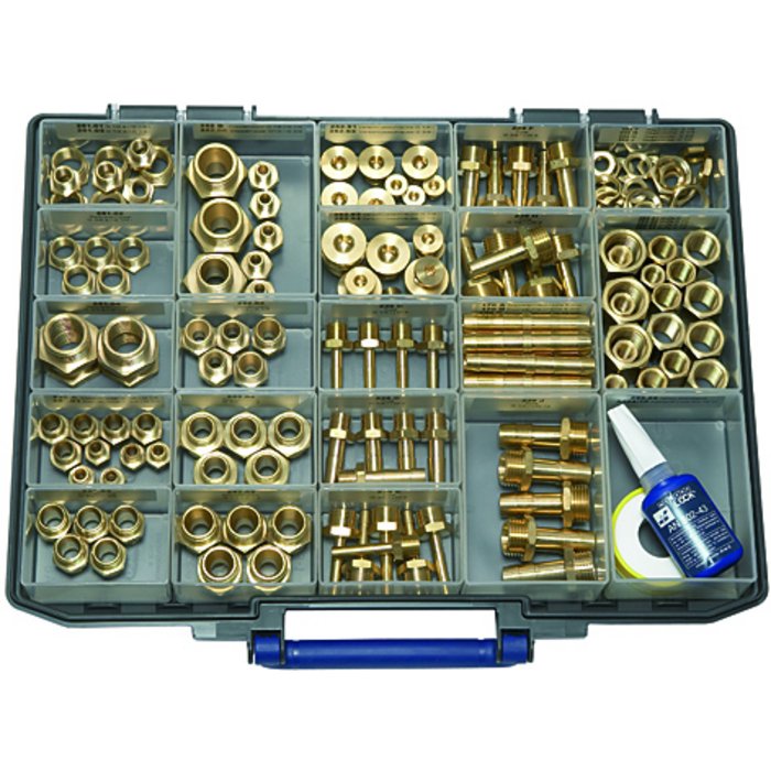 30 male hose fittings G 1/4-6, G 1/4-9, G 3/8-6, G 3/8-9, G 1/2-9, G 1/2-13<br>38 double nipples G 1/8 x G 1/8, G 1/8 x G 1/4, G 1/4 x G 1/4, G 1/4 x G 3/8, <br>G 3/8 x G 3/8, G 3/8 x G 1/2, G 1/2 x G 1/2, G 1/2 x G 3/4<br>19 reducing nipples G 1/4 m x G 1/8 f, G 3/8 m x G 1/4 f, G 1/2 m x G 3/8 f, G 3/4 m x G 1/2 f<br>18 sockets G 1/8, G 1/4, G 3/8, G 1/2<br>20 plugs G 1/8, G 1/4, G 3/8, G 1/2<br>15 double hose fittings 6, 9, 13 mm<br>20 lock nuts G 1/8, G 1/4, G 3/8, G 1/2<br>1 thread adhesive 10 ml<br>1 PTFE sealing tape
