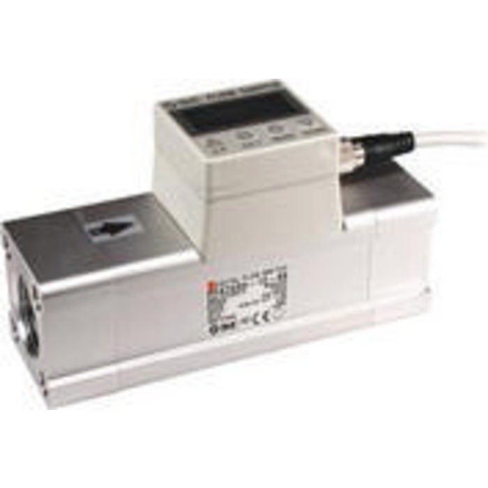 Digital flow switch for high flow, series PF2A, for dry air, with integrated display unit, measuring range 30 to 3000 l/min, smallest adjustment unit 5 l/min, media temperature 0 to 50 °C, operating temperature range 0 to 50 °C, repetition accuracy max. ±3% of the measuring range, temperature characteristic max. ±2% of the measuring range. (0 to 50 °C, based on 25 °C), current consumption max. 150 mA, measuring principle thermistor (heating element), operating display 3-digit, 7-segment LED (illuminates at output signal ON OUT1: Green