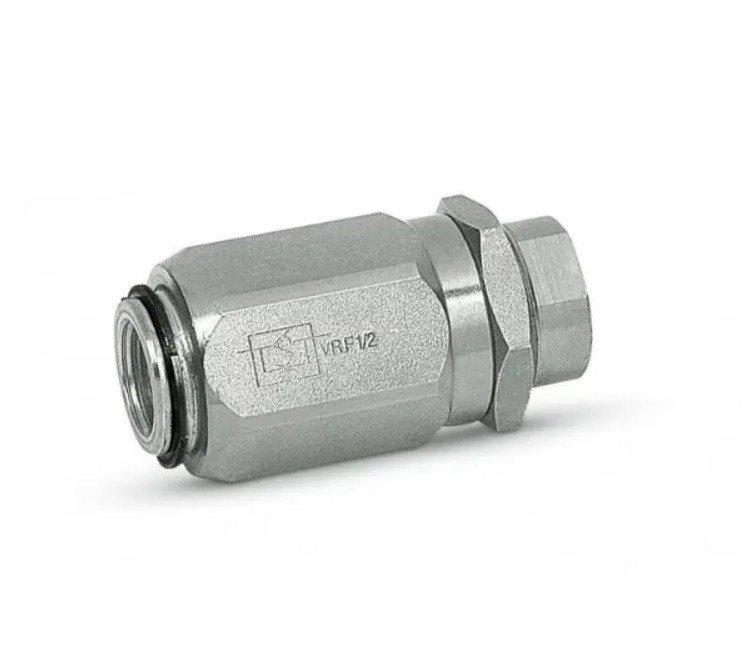 Клапан VRF 1/4" от Oleodinamica Marchesini, который регулирует скорость потока рабочей жидкости в одном направлении и обеспечивает свободный поток в другом. Поскольку в дросселе-бочке давление не компенсируется, то регулировка жидкости зависит от давления и вязкости масла.