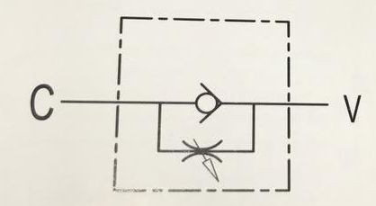 Клапан VRF 3/4" от Oleodinamica Marchesini, который регулирует скорость потока рабочей жидкости в одном направлении и обеспечивает свободный поток в другом. Поскольку в дросселе-бочке давление не компенсируется, то регулировка жидкости зависит от давления и вязкости масла.