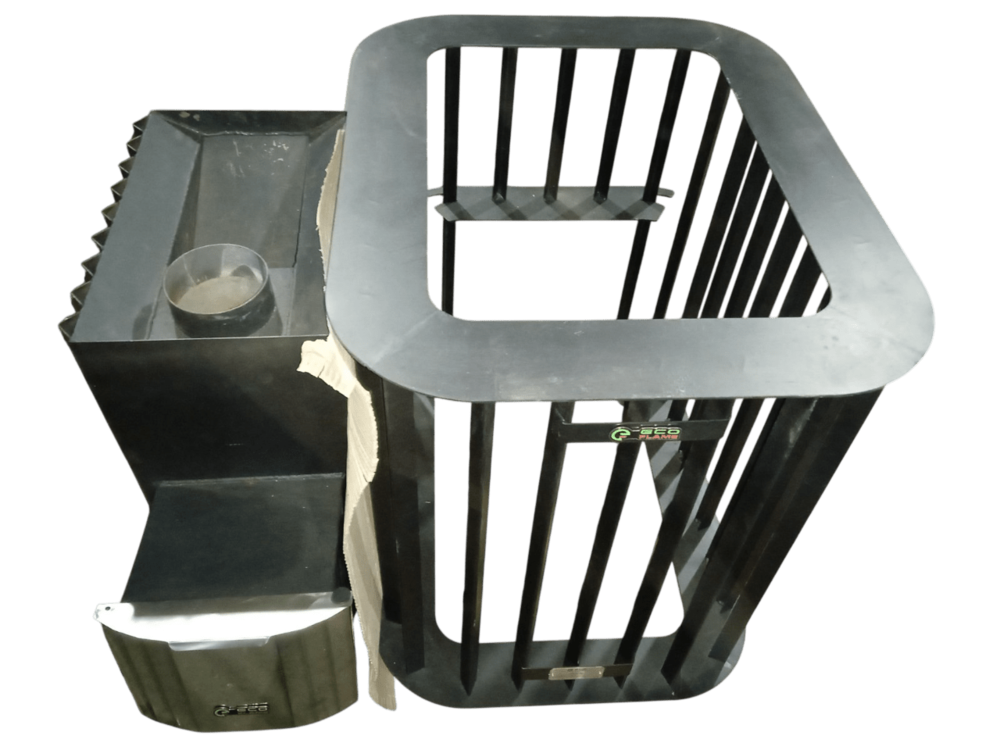 Печка для бани «Скала» украшена стильной сеткой для закладки большой массы камней.