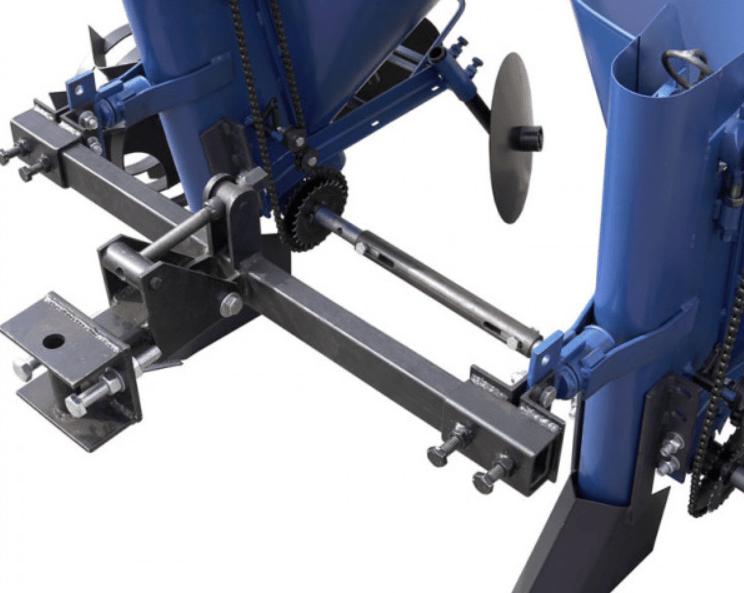 Обороты от колес передаются по цепной передаче в корзины, сошники формируют борозду, корзины выкладывают клубни, а окучники при возвращении засыпают их землей. Регулируемое междурядье настраивается легко с помощью замков.