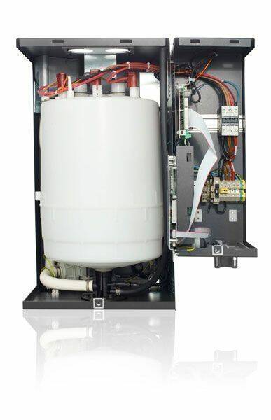 • Агрегат имеет функцию само очитки электродов, что значительно продлевает эксплуатационный срок нагревателей и самого парогенератора. Очистка происходит благодаря встроенной системе продувки и направленным движением переменного тока благодаря чему известковые частички постоянно находятся во взвешенном состоянии и удаляются с помощью дренирования воды.