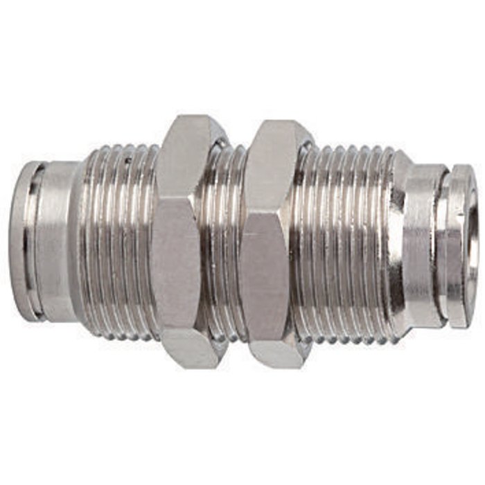 Push-in fittings, manufactured entirely in nickel-plated brass. All parts with a parallel thread are supplied with an FPM O-ring.<br>All parts with conical threads are coated with preCOTE 5 dispersion, all fittings in this series can thus also be used at high temperatures (medium compressed air).