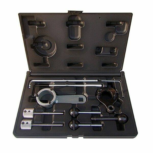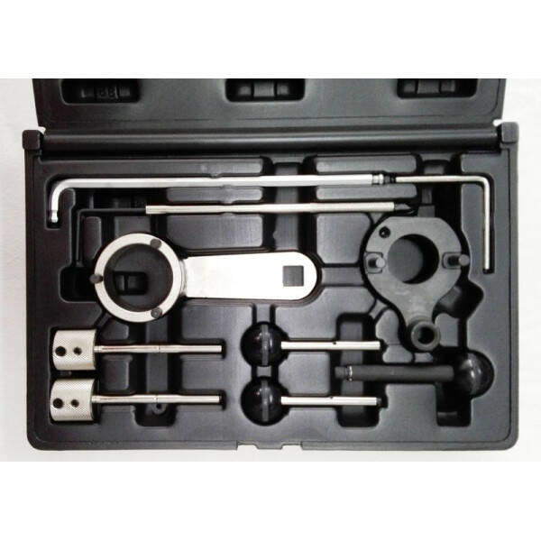 Комплект приспособлен для блокировки коленчатого вала, шкива распределительного вала и топливного насоса в подходящем положении, приспособленном для разборки и замены ремня или распределительного вала.