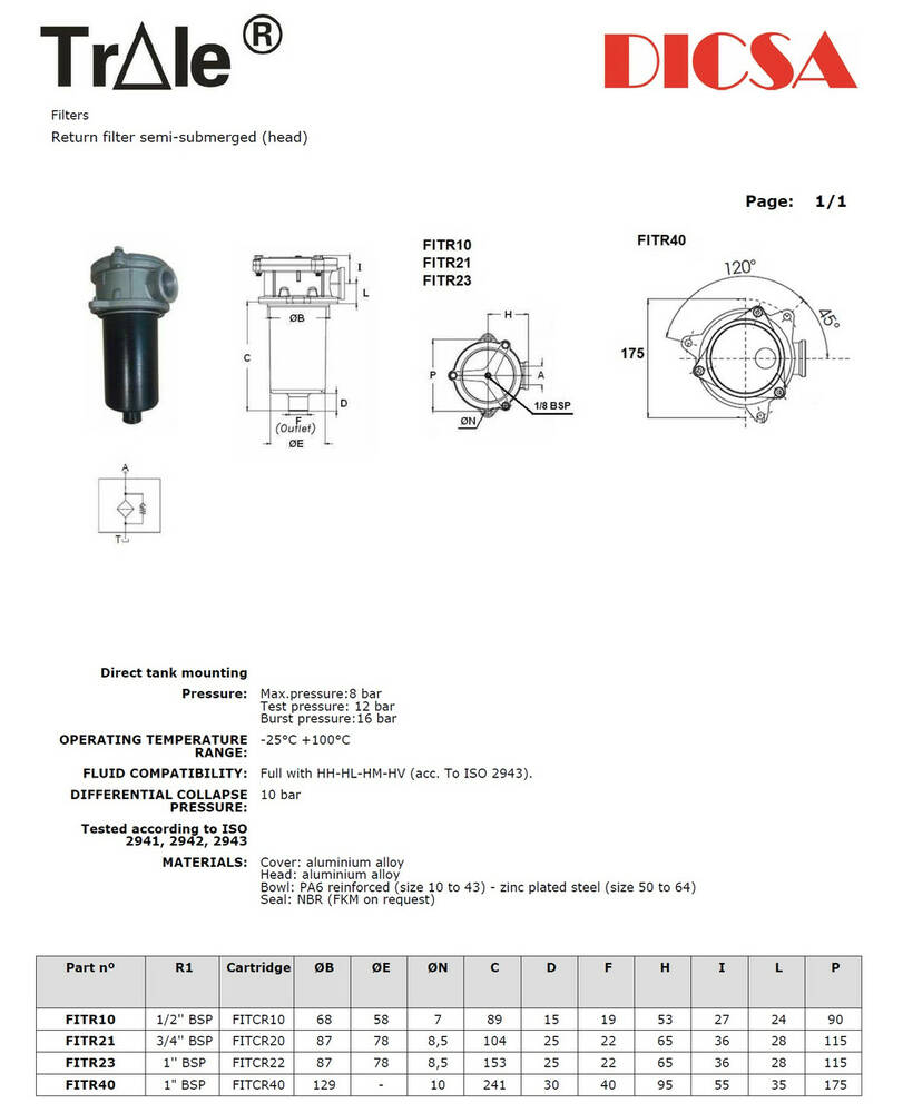 Данный фильтр является сливным фильтром, который устанавливается на обратной линии слива масла из гидросистемы в бак. Имеют стандартную комплектацию с перепускным клапаном и без индикатора загрязненности. Сливные фильтры были разработаны, чтобы защитить гидравлический бак от загрязнения, в соответствии с международными стандартами ISO 4406.