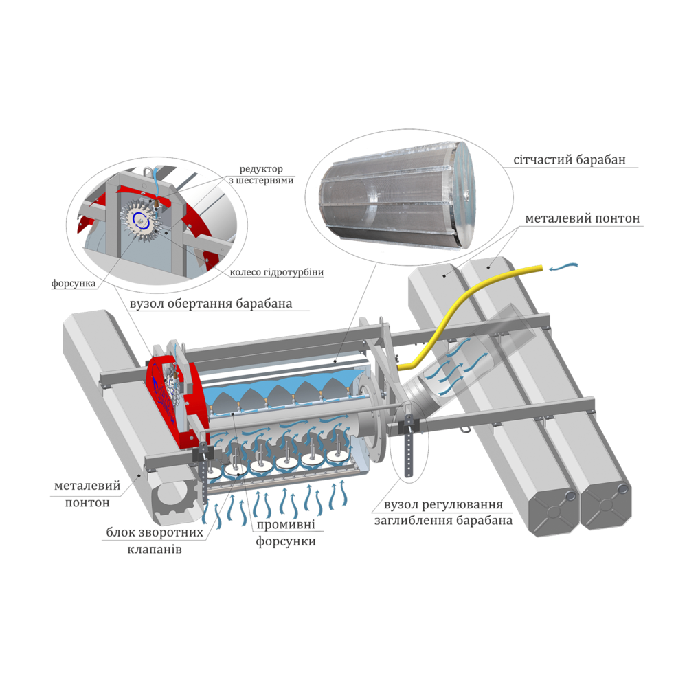 Фільтр — це обертовий сітчастий барабан, встановлений на трьох