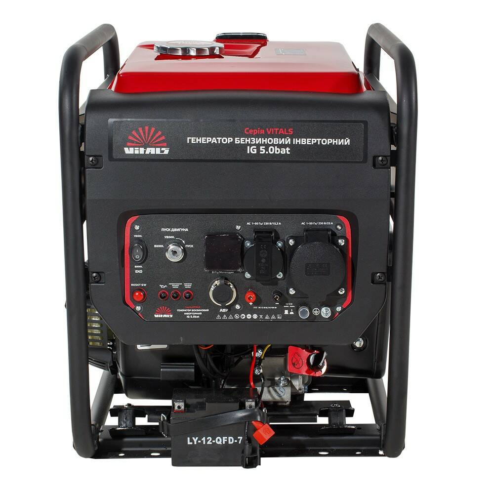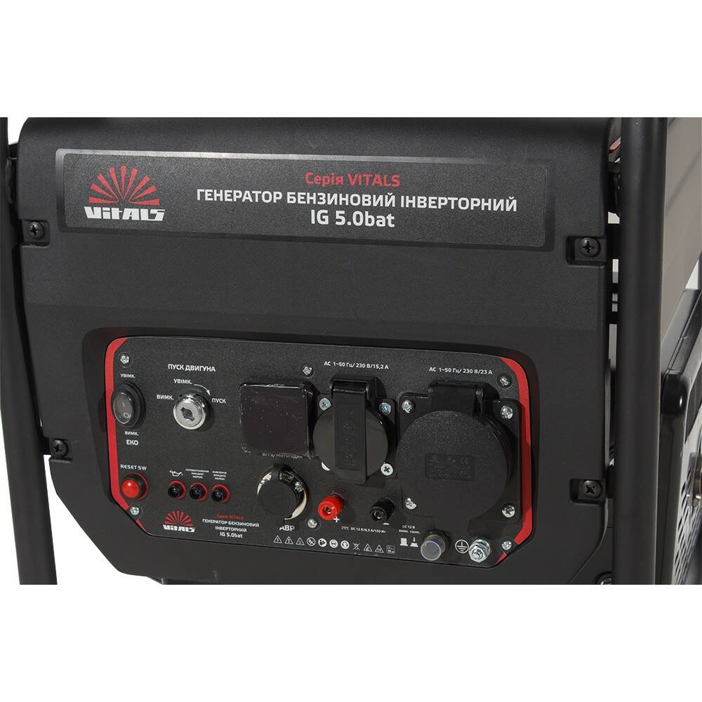 Особливості Номінальна витрата палива - 394 г/кВт*година; Коефіцієнт потужності (сos Ф) – 1; Розетки, 230В/16А – 1; Розетки, 230В/32А – 1; Цифровий контролер 3в1 - Напруга/Частота струму/Мотогодинник; Порти USB, 5В/2А – ні; Режим «ЕКО» – є; Регулятор напруги – інверторний модуль; Режим паралельного підключення – ні; Об'єм масла в картері - 0,6 л; Паливо Бензин А-92; Інверторний генератор Vitals IG 5.0bat виробляє електроенергію з правильною синусоїдою, що робить його ідеальним для живлення чутливого електронного обладнання, такого як комп'ютери, телевізори, опалювальні котли та інші пристрої, чутливі до синусоїди струму. У генераторі Vitals IG 5.0bat застосований чотиритактний бензиновий двигун із верхнім розташуванням клапанів. Інноваційна конструкція кришки стартера та крильчатки охолодження запобігає перегріву двигуна. Глушник промислового типу забезпечує посилене шумопоглинання, покращене відведення та розподіл тепла. Шум та вібрації при роботі додатково гасять демпферні опори, якими двигун кр
