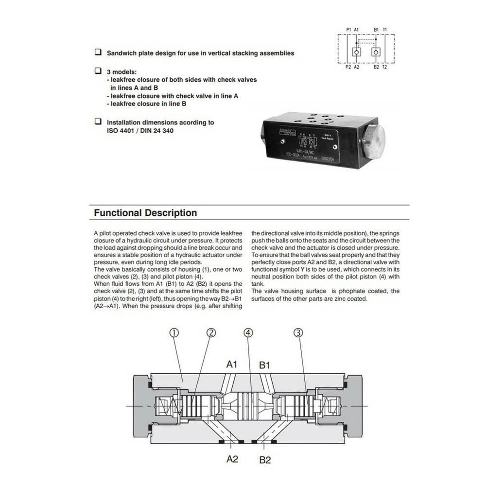 Клапан - дивертор сохраняет постоянный перепад давления над пропорциональным направленным клапаном, вследствие чего колебания давления, вызванные насосом, не влияют на поток. Желаемый перепад давления между P и A, B-линиями регулируется  5-40 бар.