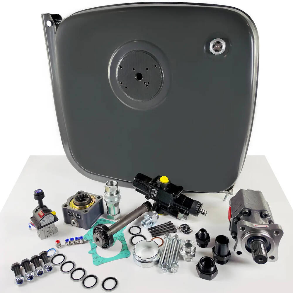 Комплект гидравлической системы для тягача-самосвала включает вал и коробку отбора мощности (КOM) на коробку передач ZF, гидравлический насос, распределитель, маслобак, пневматический джойстик управления и другие необходимые компоненты.