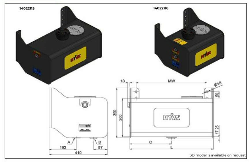Гидравлический бак бокового монтажа SCISSOR-50L/35L-MF (без плиты) Hyva имеет объем 50 литров, с рабочим объемом 35 литров. Бак оптимально защищен от воздействия коррозии внутри и снаружи. Порошковое покрытие обеспечивает защиту от неблагоприятных воздействий окружающей среды. Все баки очищаются, а затем испытываются под давлением для проверки на утечки.