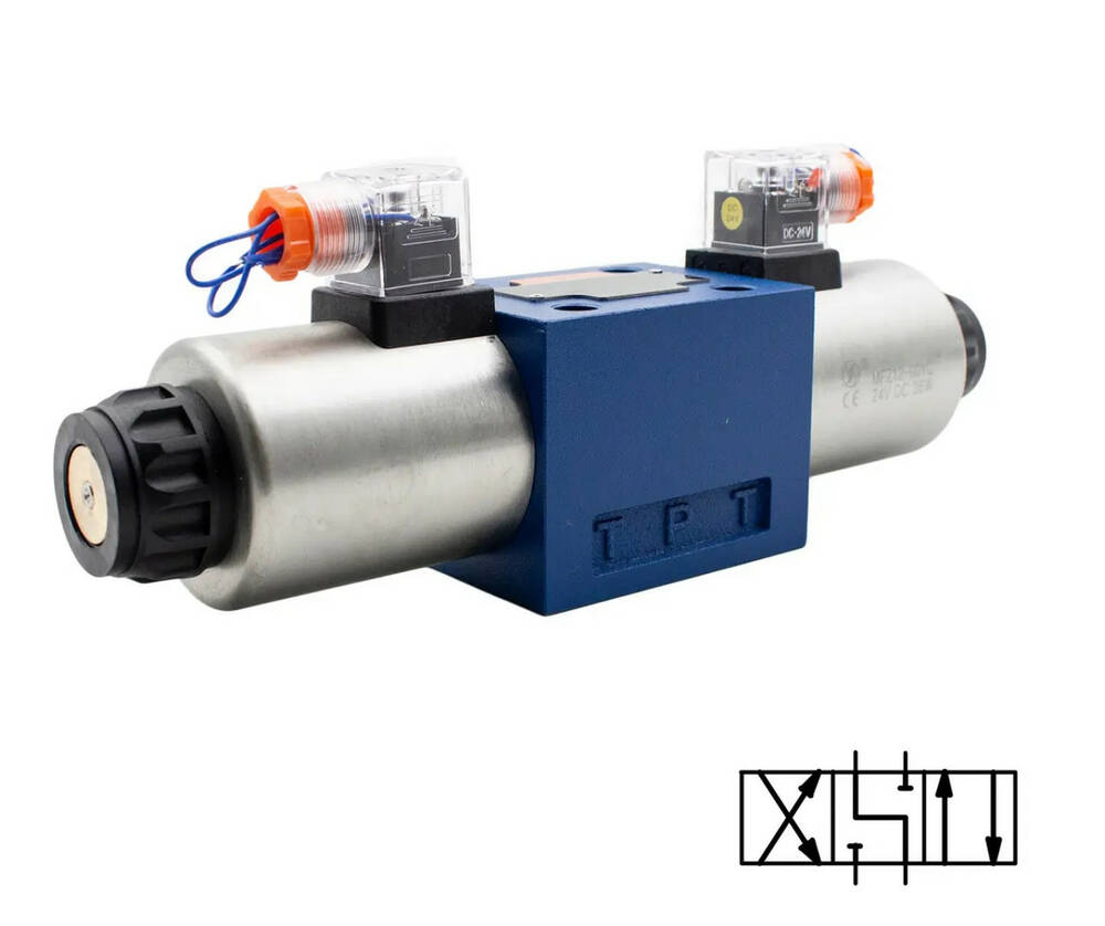 Гидравлические распределители 4WE10L-3XCG24N9Z5L (ДУ10, схема L, схема 74) предназначены для управления и изменения направления или пуска и останова потоками рабочих жидкостей в гидравлических системах. Переключение положения золотника происходит с помощью управляющего элемента – электромагнита (привода электромагнитного).