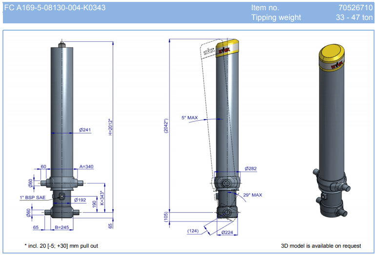 Этот цилиндр является только подъемным устройством. Он не должен использоваться в качестве структурного элемента и не должен подвергаться боковой нагрузке. Клапан опрокидывания должен иметь перепускное давление на входе в цилиндр не выше максимально допустимого рабочего давления.