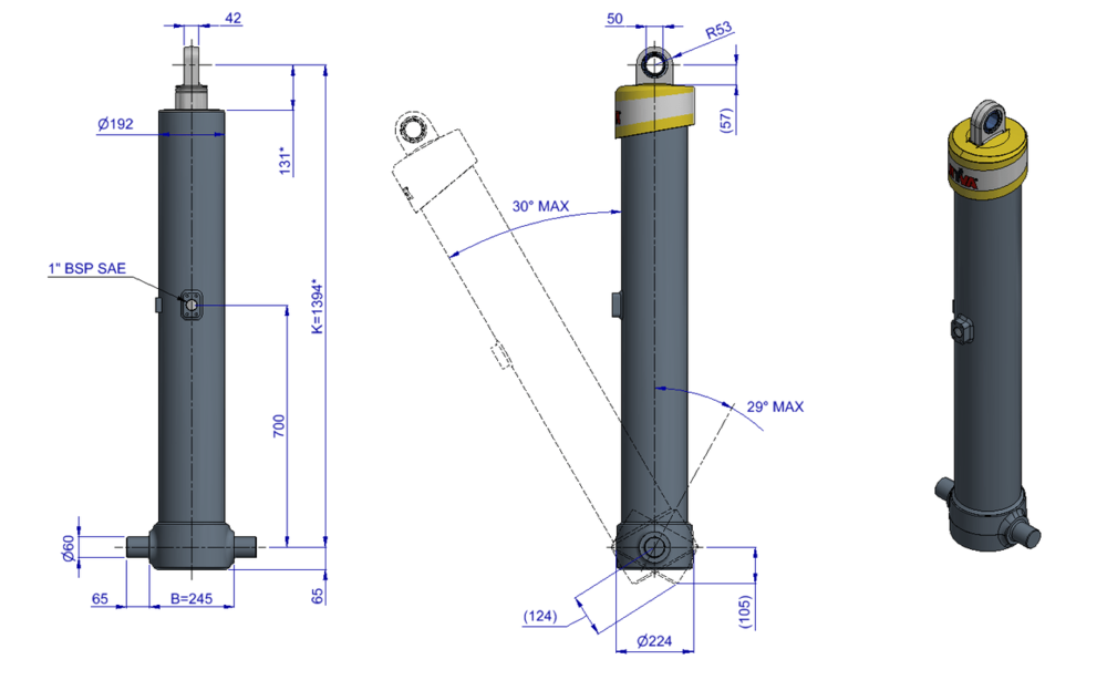 Цилиндры FE производства Hyva легки, прочны, стабильны и не требуют технического обслуживания. Обычно они применяются с наклонными передними стенками. Цилиндры FE способны осуществлять разгрузку опрокидыванием груза весом более 100 тонн.