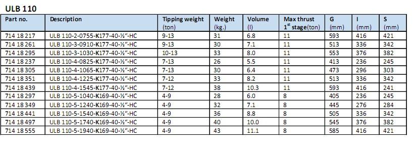 Характеристики Гидроцилиндров Hyva Серии ULB 110: