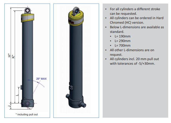 Стандартный цилиндр гидравлический Hyva работает под давлением 190 бар. Такое относительно высокое давление и эффективный метод закрепления дают возможность использовать легкие цилиндры для быстрого подъема тяжелых грузов. Для специализированного предназначения Hyva может поставлять другие специальные виды цилиндров.