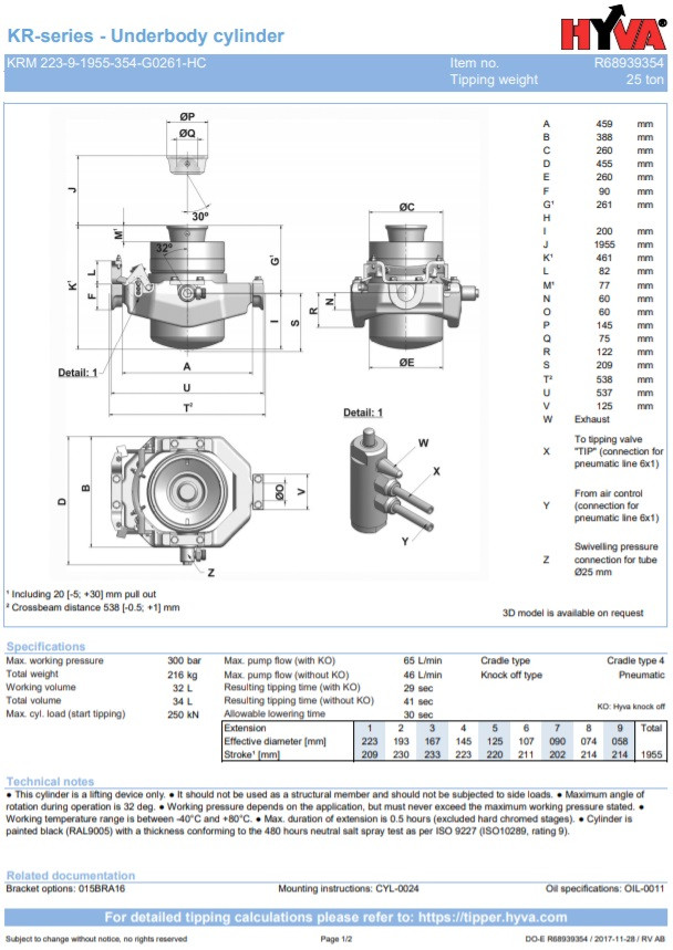 Цилиндры KRA / KRM поставляются с переходником BSPOT adapter ”. Рабочее давление цилиндров составляет 280 бар (300 макс.) Крепление, опора и кронштейны уже смонтированы. Стандарт KRM имеет пневматический механизм, стандарт KRA имеет гидравлический удар. Опрокидывающая масса рассчитана на 275 бар.