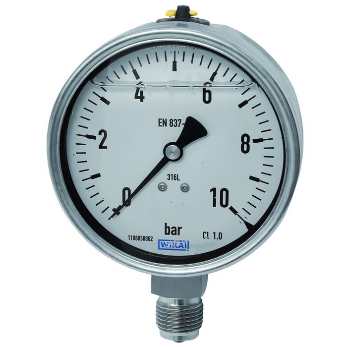 Glycerine-filled bourdon-tube pressure gauge, CrNi steel type