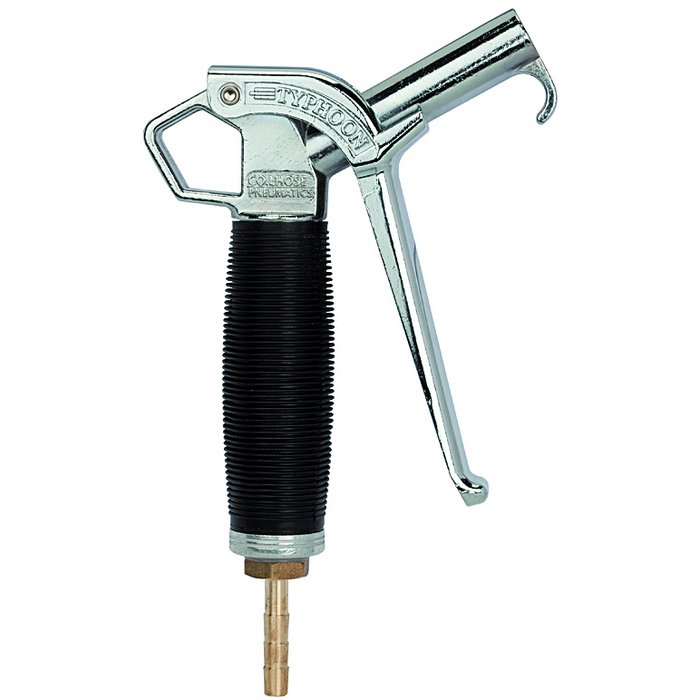 In combination with the safety nozzles described below, this blow gun meets a wide range of safety requirements. Steplessly adjustable, lightweight and ergonomically optimised high-volume blow gun with exceptionally high blowing power. The »Typhoon« model, which achieves approximately three times the blowing power of conventional guns, rests comfortably and securely in the hand even when full pressure is applied.