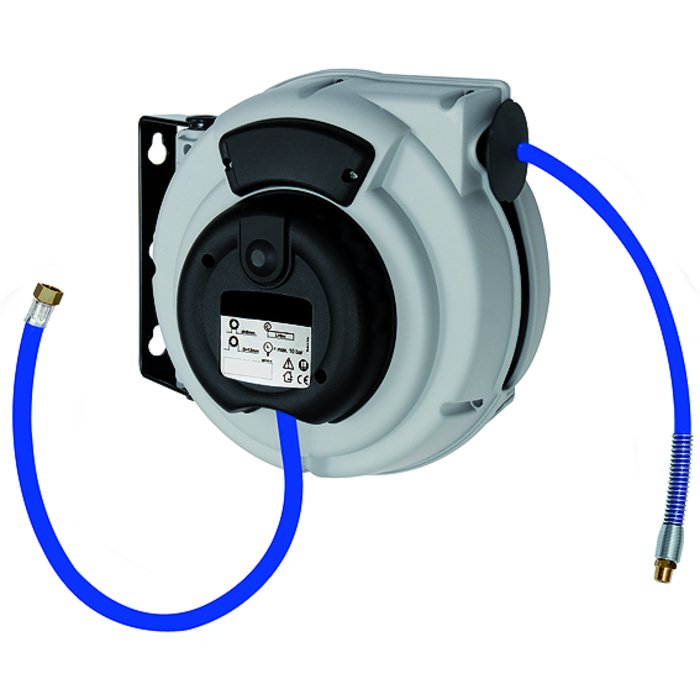 Hose reel with automatic rewind and spring assembly. Robust hose locking mechanism, impact resistant plastic casing. Swivel wall mount made made from coated steel. Easy mounting on the wall or ceiling.
