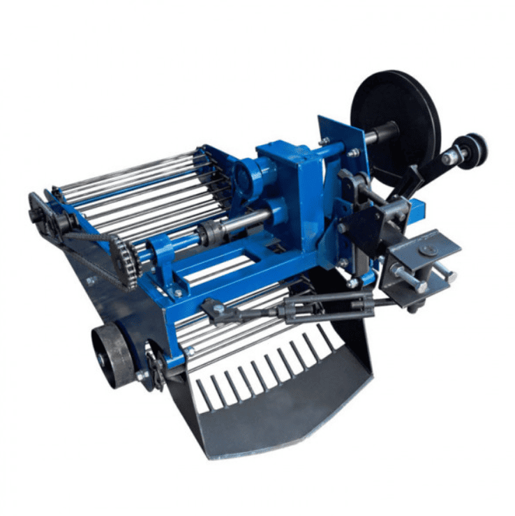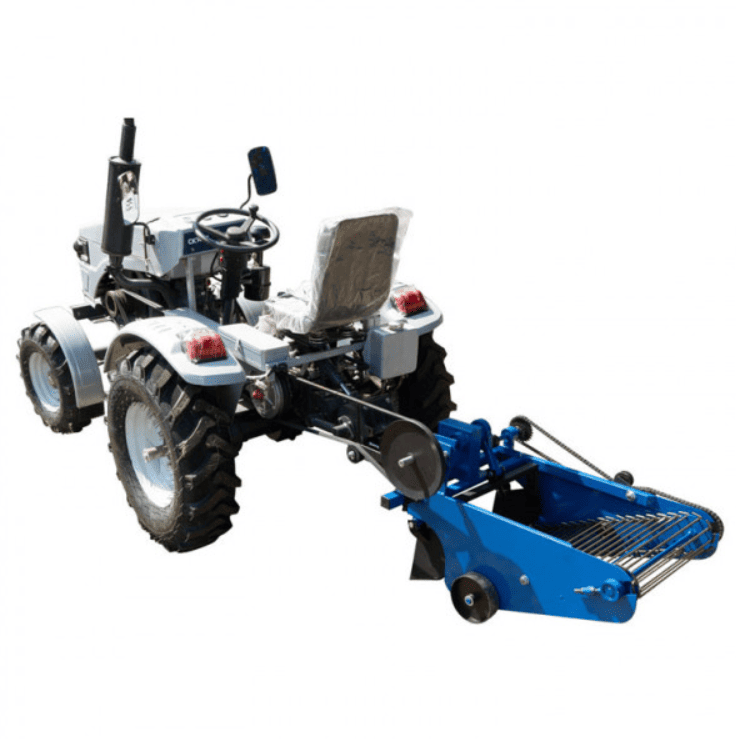 Копач имеет активный нож шириной 455 мм, который обеспечивает глубину копания до 15 см. Благодаря двум ключевым элементам – ножу и транспортерной ленте – достигается эффективное отделение клубней от земли при минимальном повреждении урожая. Оборудование работает за счет привода от шкива или свободного ручья на барабане сцепления мототрактора.