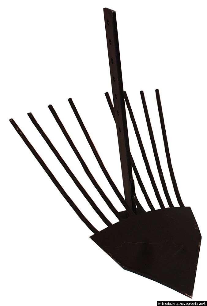 Стойка картофелекопателя изготовлена из стальной полосы 10 х 50 х 500 мм. Имеется 7 отверстий диаметром 12,5 мм, под болт М12. Лопата изготовлена из стали и имеет толщину 3 мм. Длина от носика лопаты до стойки составляет 300 мм. Есть усилитель из стального прутка Ø10 мм. Также копалка имеет подошву толщиной 6 мм. В задней части копалки имеются перья (они же зубья), их восемь. Зубья изготовлены из стального прутка Ø10 х 400 мм. Общая длина копалки (от носика лопаты до края зубьев) составляет 550 мм, максимальная ширина по крайним точкам 350 мм.