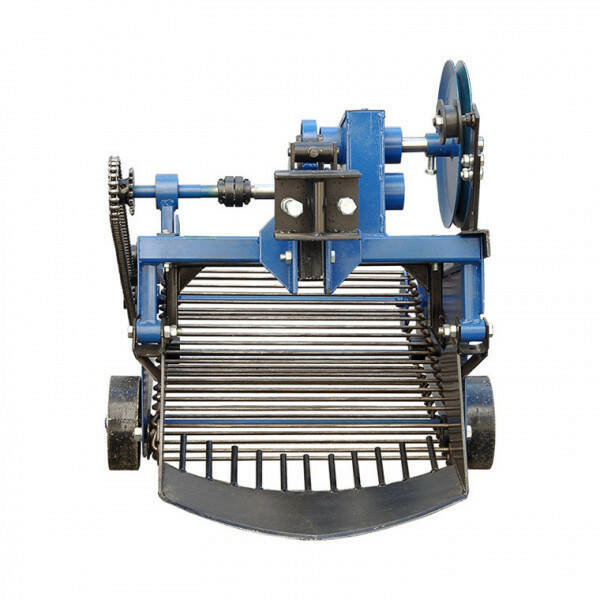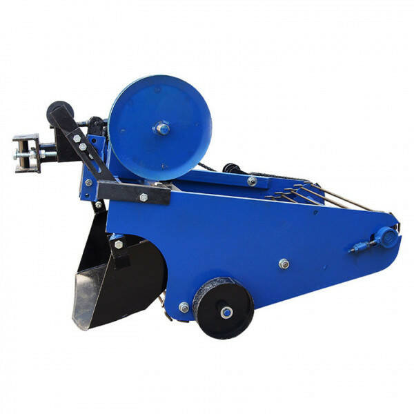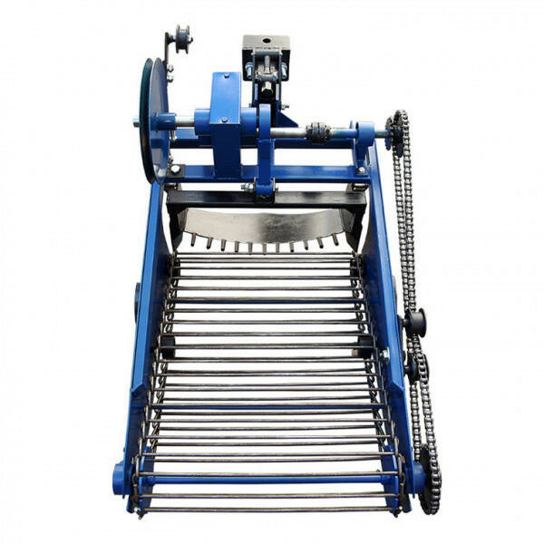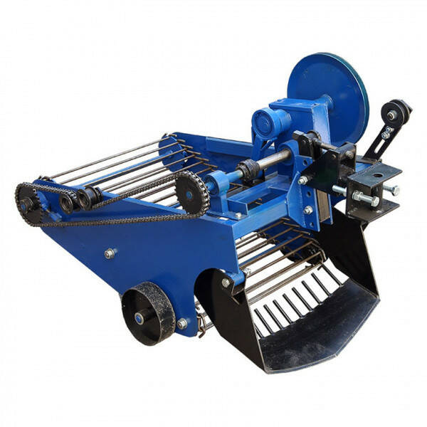 Ремінна передача від шківа мотоблока до шківа картоплекопача активізує роботу редуктора. Транспортер приводиться в рух від редуктора через ланцюгову передачу між зірочками. Ніж активізується від роботи шатуна з ексцентриком, яка теж запускає в дію редуктор. Ніж підрізає ґрунт з картоплею і подає на стрічку. Рухаючись по ній, бульби відокремлюються від землі і падають на поверхню, а грудки, розбиваючись просипаються крізь прути.
