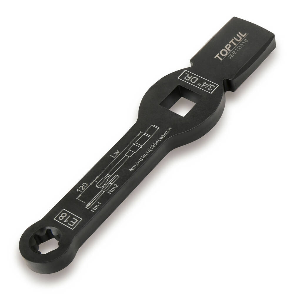 TOPTUL JEBT0118 — специализированный ударный ключ с профилем E18 и квадратом 3/4", предназначенный для демонтажа и монтажа тормозных суппортов на коммерческих автомобилях MAN TGL/TGM без необходимости снимать.
