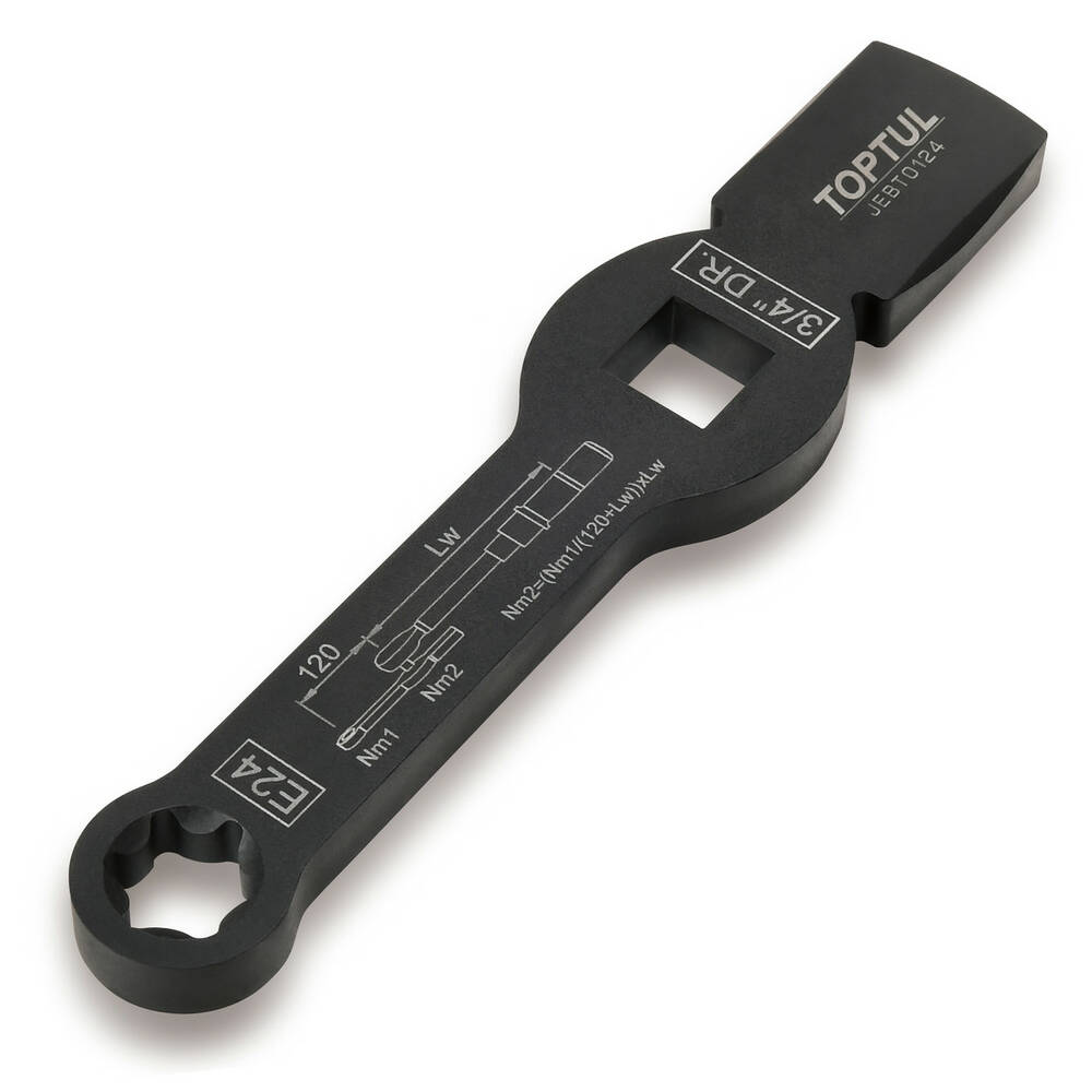 TOPTUL JEBT0124 — специализированный ударный ключ с профилем E24 и квадратом 3/4", предназначенный для демонтажа и монтажа тормозных суппортов на коммерческих автомобилях MAN TGA/TGS/TGX без необходимости