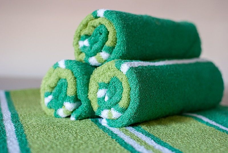 Обратите внимание на махровые полотенца, выполненные в ярких зеленых цветах.