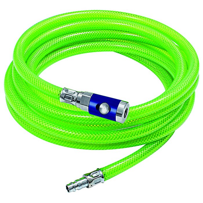 Гибкий, стойкий к давлению и стойкий к истиранию стандартный шланг. Высокая безопасность благодаря использованию сигнальной люминесцирующей зеленой краски. Сборка с использованием предохранительной муфты с нажимной кнопкой NW 7,4 и вставного наконечника из никелированной латуни.