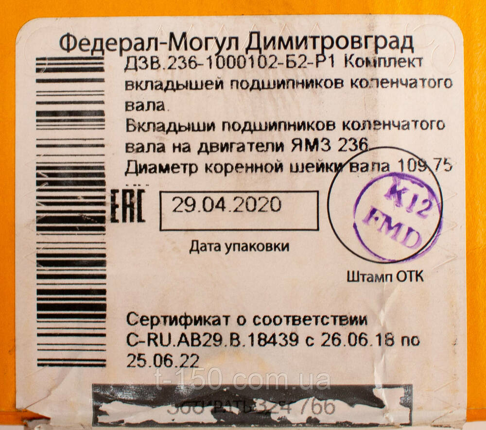 Вкладыши коренные Т-150 МаЗ ЯМЗ-236, Р1, 236-1000104-Б2-Р1