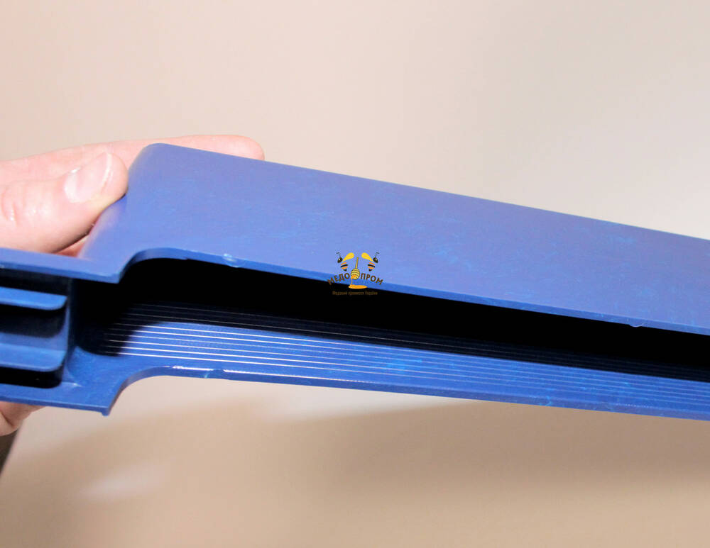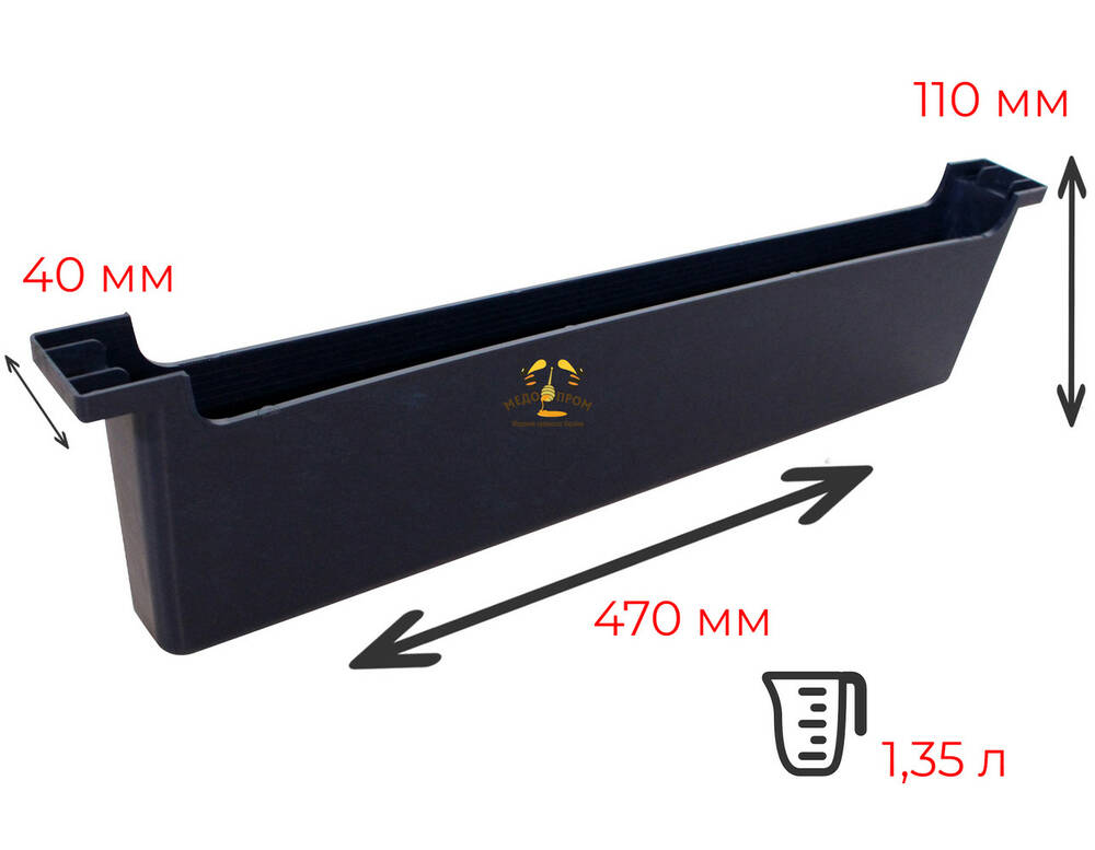 Объем кормушки 1,35 литра позволяет заливать достаточное количество питательного раствора для пчел, что удобно для пасечников, так как реже нужно пополнять корм. Ушки по краям кормушки обеспечивают легкое извлечение и установку без риска повредить рамки или ульевые конструкции.