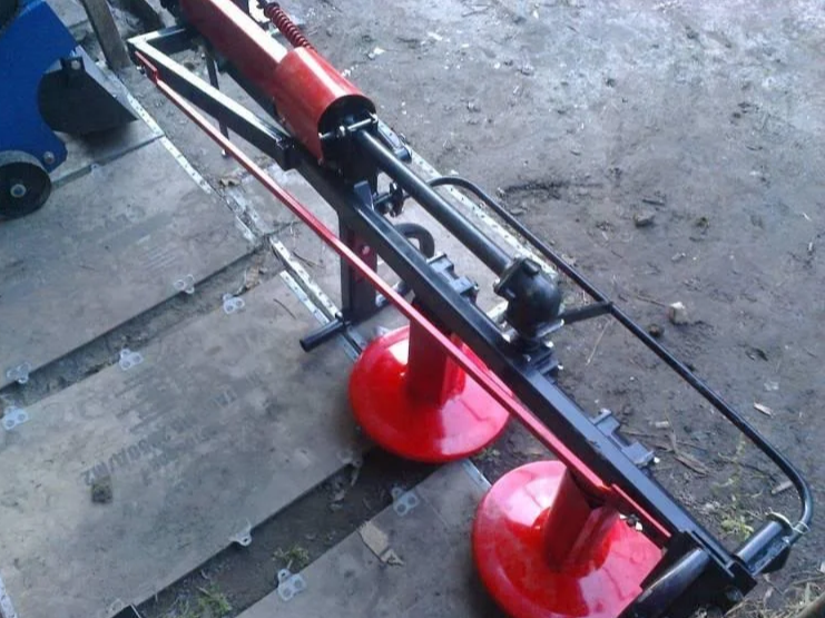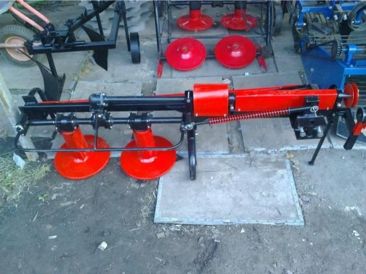 Такая конструкция намного эффективнее, чем когда косилка крепиться спереди. Ширина колеи мототрактора, чаще всего, шире захвата косилки. Благодаря такому решению, скос происходит качественно и трава не приминается колесами.