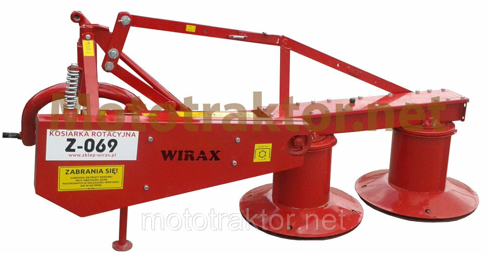 С помощью данной сенокосилки можно без труда привести в порядок Ваши угодья и приусадебные участки. Для заготовки на зиму сена животным лучше приспособления не придумать. Косилка навесная предназначена для скашивания, или обкоса травы с помощью трактора. Навешивается на трех-точечный навесный механизм сзади трактора. Работает от вала отбора мощности (ВОМ). Рекомендуемая мощность используемого трактора для "Wirax" Z-069 от 20 л.с., но можно и мощнее.