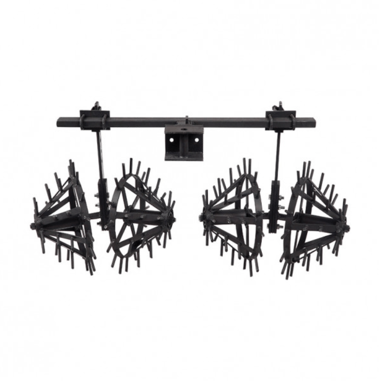 Комплект состоит из рамы и двух рабочих секций. Каждая секция имеет стойку из стальной полосы 50×10×500мм и два конусных роторных рабочих органа с приваренными шипами. Диаметр оси – 22мм, шипа – 10мм. Для плавности вращения использованы подшипники 204.