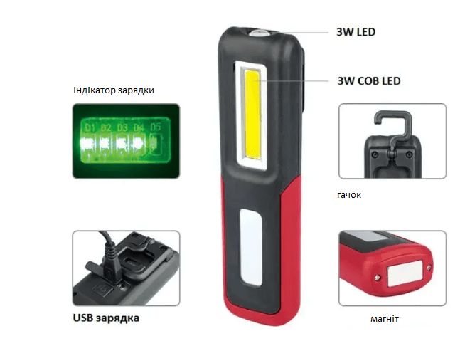 Ліхтар магнітний з підвісом COBLED/RED IP44 Li-pol 1200 mAh