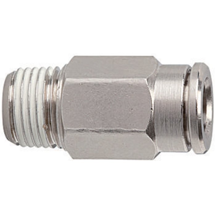 Push-in fittings, manufactured entirely in nickel-plated brass. All parts with a parallel thread are supplied with an FPM O-ring.<br>All parts with conical threads are coated with preCOTE 5 dispersion, all fittings in this series can thus also be used at high temperatures (medium compressed air).