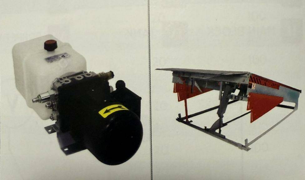 Маслостанция для откидной рампы доклевелера (Swing Type Dock Leveler). Это доклевелер с поворотной (откидной) кромкой, в отличие от телескопического доквелера “telescopic”, где кромка выдвигается телескопически.
