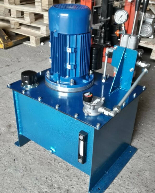 Гидравлическая маслостанция оснащена электромотором мощностью 3 кВт и скоростью вращения 1500 об/мин, максимальное рабочее давление до 220 бар. Насос станции имеет рабочий объем 10 см3/об. Масляный бак объемом 40 л выполнен из стали.