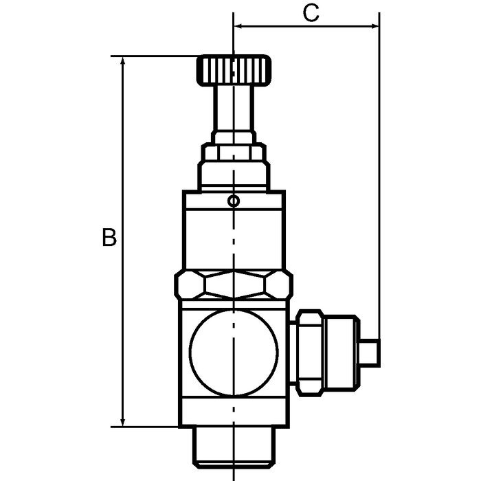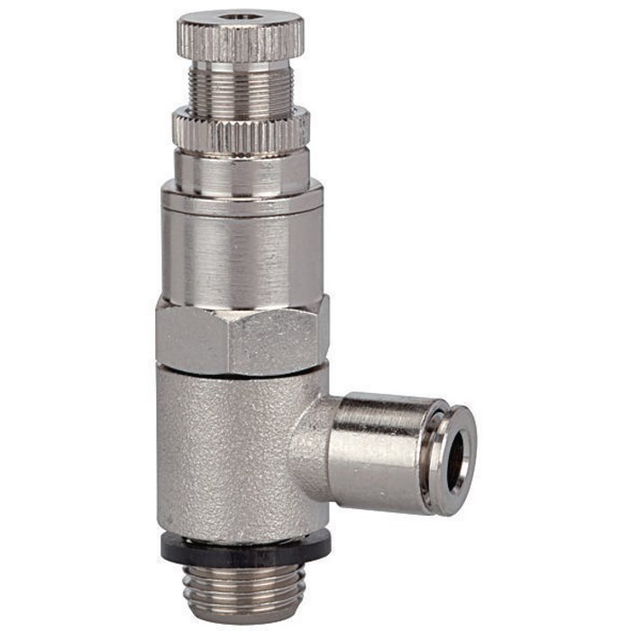 Piston pressure regulator with self-relieving design, hollow bolt and pivoting ring piece. The regulator is screwed directly into the consumer (e.g. cylinder, handling equipment, etc.). The working pressure can thus be adapted to the specific application.
