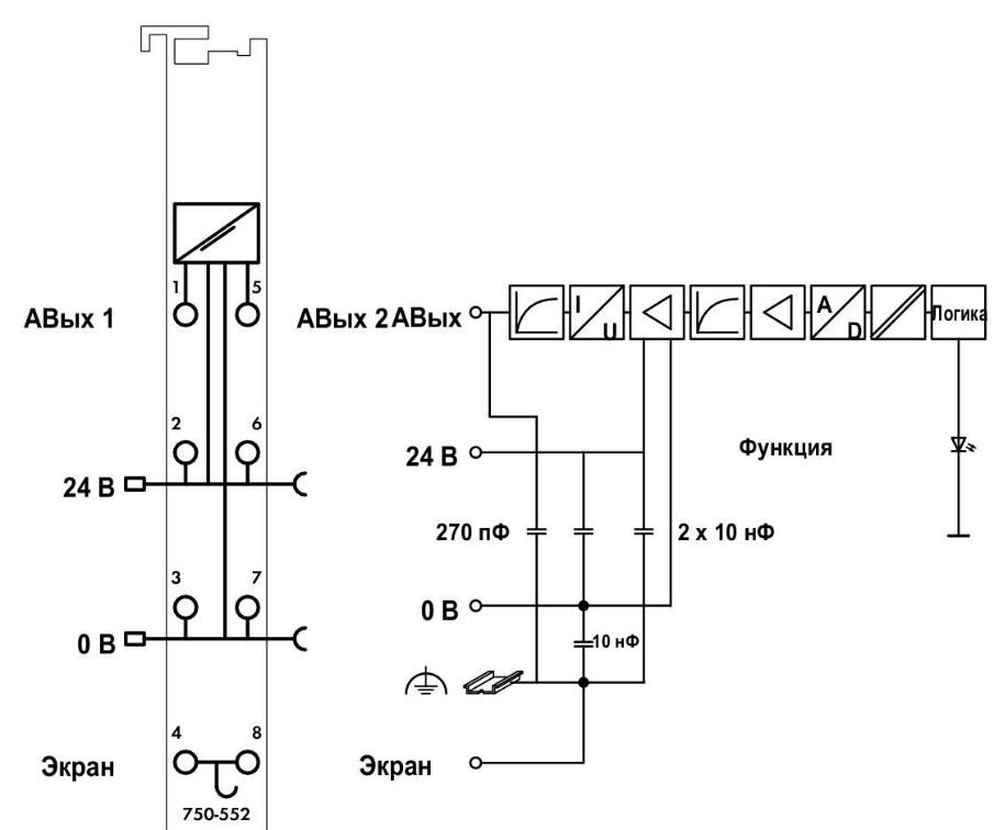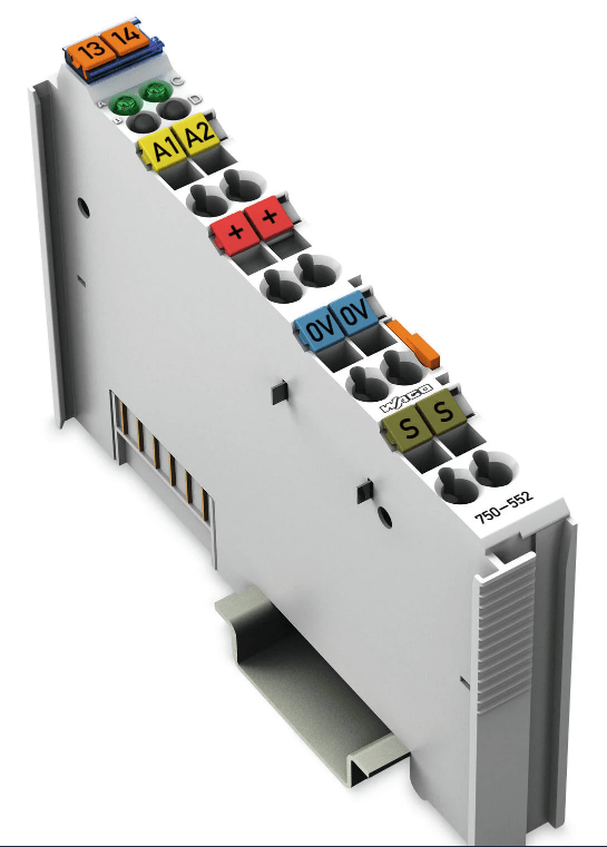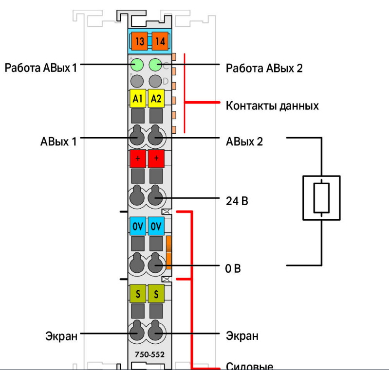 Двоканальный аналоговый модуль вывода 750-552 создает сигнал со стандартизированными значениями 0 - 20 мА или 4 - 20 мА. Выходной сигнал передаётся с 12-бытным разрешением.