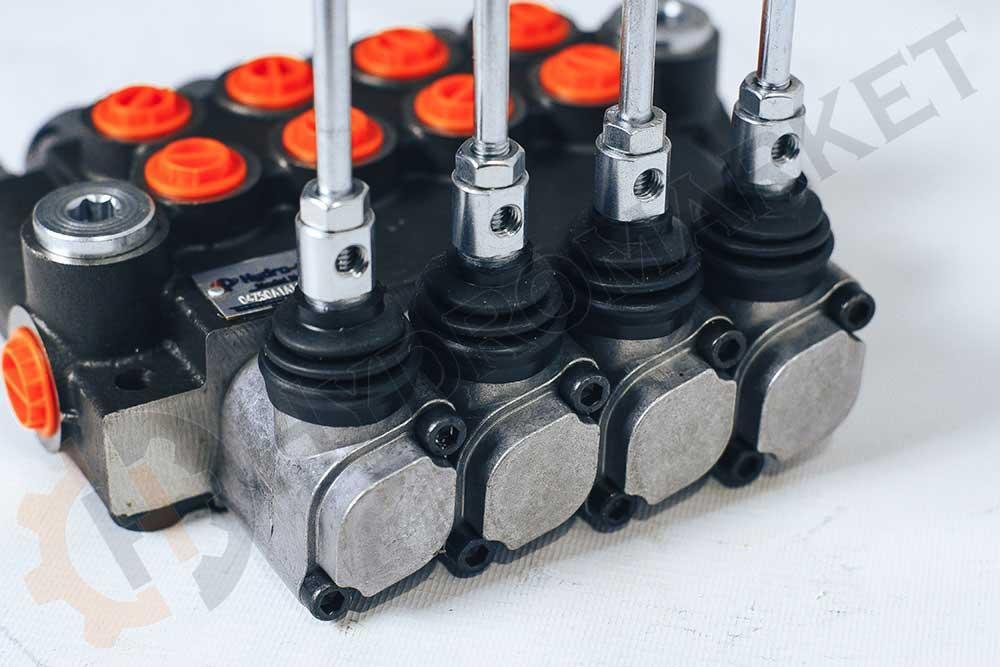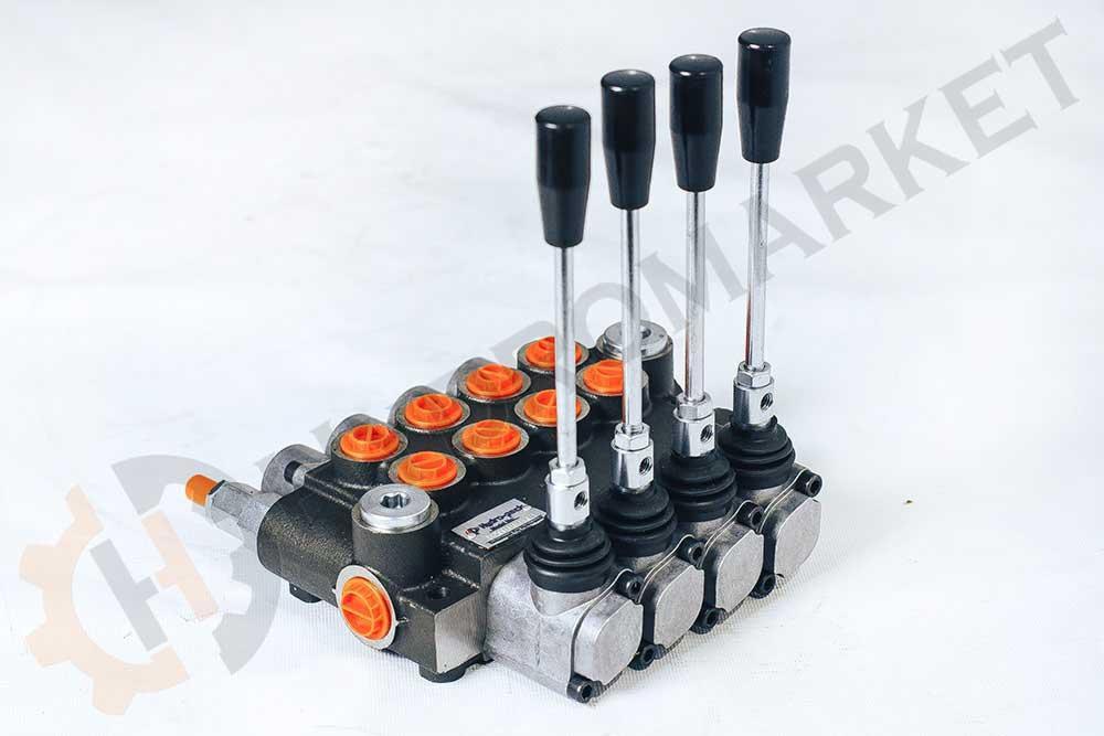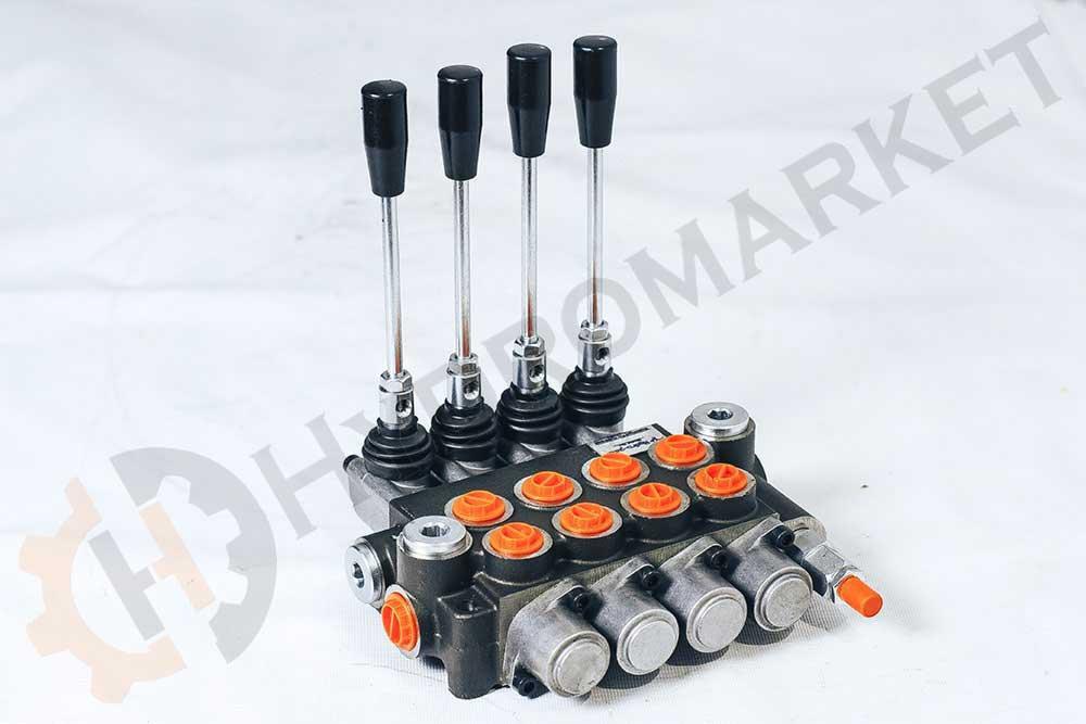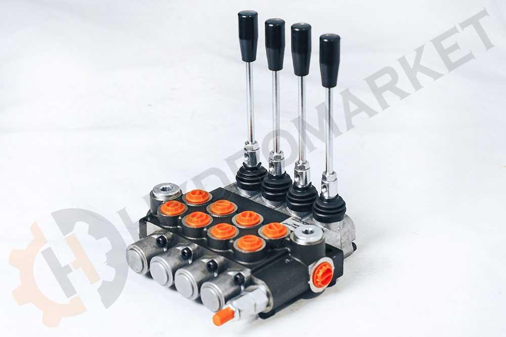 Моноблочный гидрораспределитель - дивертор 4p40 служит для пуска, остановки и контроля за расходом рабочей жидкости между генераторами напорного потока (гидравлические насосы) и потребителями рабочего потока жидкости (гидроцилиндры, гидромоторы). Моноблочный распределитель - дивертор 4Р40 с ручным управлением золотниками. Золотники при помощи рукоятки управляют потоком жидкости в трех позициях. Золотники центрируются в среднем положении пружиной без фиксации в крайних положениях.