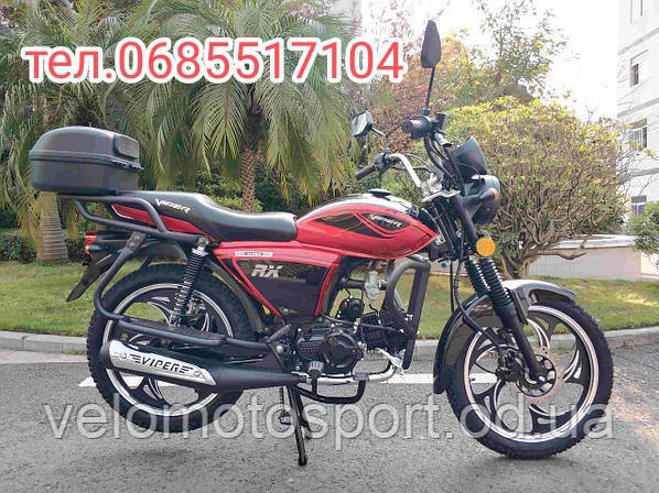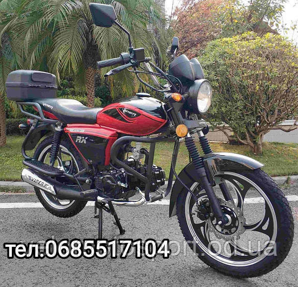 Мотоцикл Viper (Вайпер) V 125 P Alpha RX - Новая модель мопеда VIPER ALPHA RX 125 снабжена двигателем 125см3 мощностью 8,16 л/с. Главным отличием этой модели является замена всех быстро ржавеющих, металлических элементов на пластиковые. Пластик использованы при дизайне модели отличается высокой стойкостью к износу и повреждениям, а это благотворно сказывается на внешнем виде. Также все детали которые ранее подвергались хромировке теперь качественно окрашены. Установлен дополнительный багажник и литые диски.